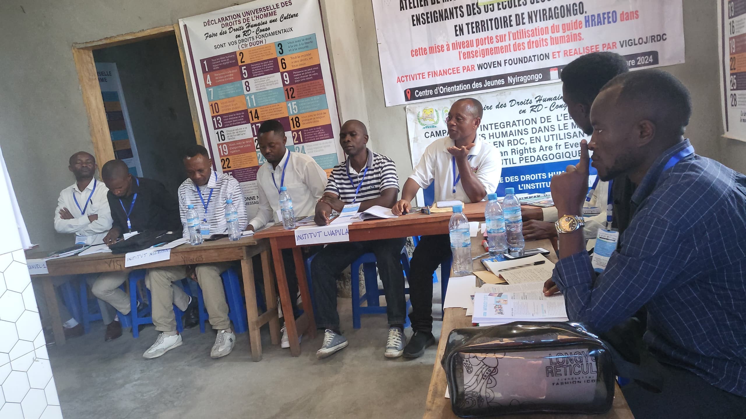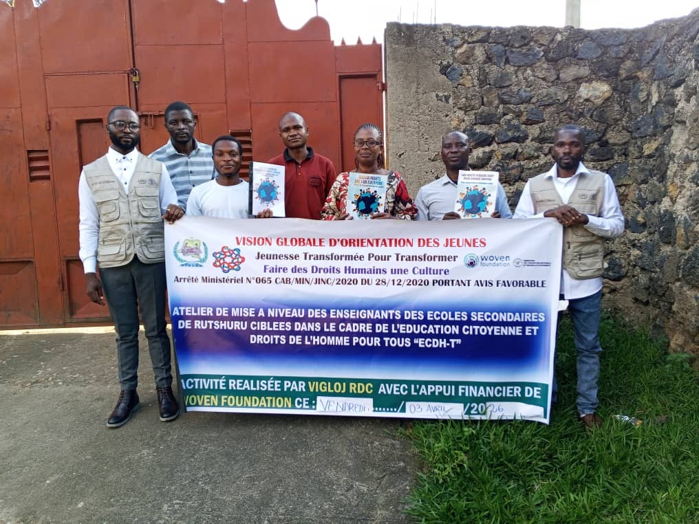 Le jeudi 02 avril 2026, VIGLOJ-RDC, en partenariat avec Woven Teaching et Woven Foundation, a lancé au site de Nyiragongo un atelier de formation destiné à dix enseignants issus de cinq écoles vulnérables du territoire. Avec l’appui pédagogique des facilitatrices de Goma, cette première journée a marqué une étape importante dans la promotion de l’éducation aux droits humains axée sur les besoins, en utilisant les outils HRAFE, DD et IT.